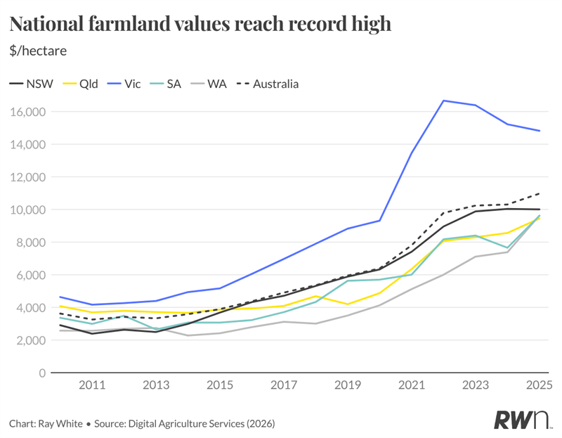 The national figure masks dramatic differences across states. Western Australia surged ahead with median prices reaching $9,635 per hectare in 2025, while Victoria commanded $14,826 per hectare, reflecting the state’s premium agricultural land and proximity to major population centres. Queensland finished the year at $9,451 per hectare, with New South Wales at $10,013 per hectare. South Australia recorded $9,618 per hectare, demonstrating the continued value investors place on the state’s grain-growing regions despite recent dry conditions.
